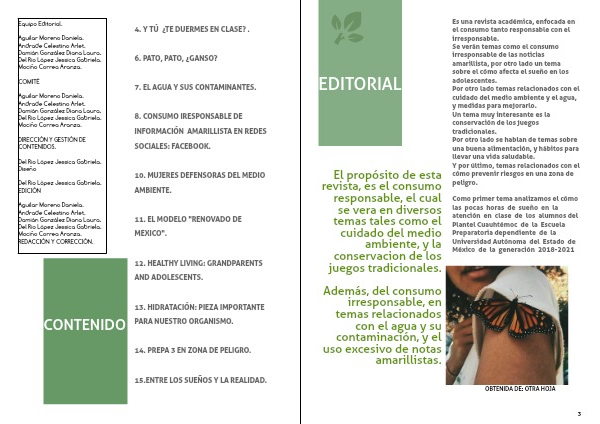 El propósito de esta revista, es el consumo responsable, el cual se vera en diversos temas tales como el cuidado del medio ambiente, y la conservacion de los juegos tradicionales.