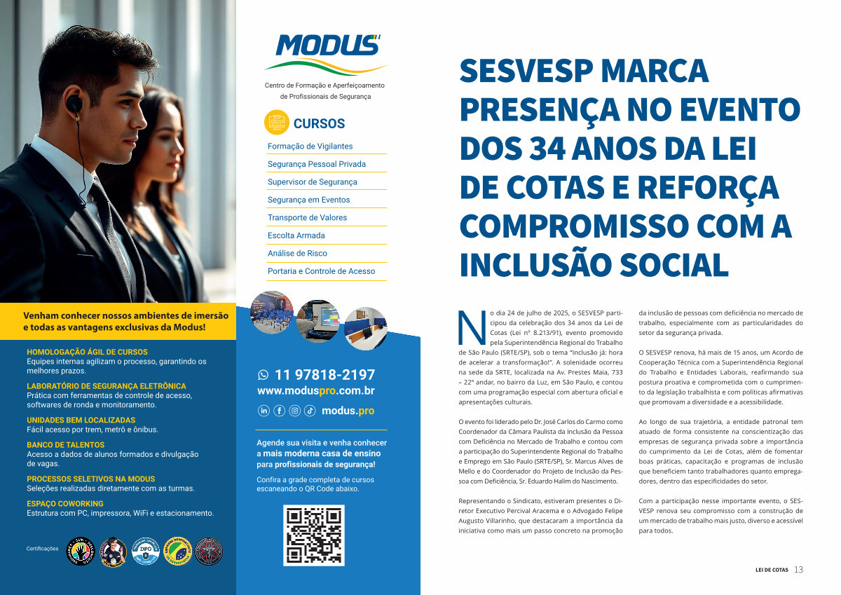 No dia 24 de julho de 2025, o SESVESP participou da celebração dos 34 anos da Lei de Cotas( Lei n º 8.213 / 91), evento promovido pela Superintendência Regional do Trabalho de São Paulo( SRTE / SP), sob o tema“ Inclusão já: hora de acelerar a transformação!”. A solenidade ocorreu na sede da SRTE, localizada na Av. Prestes Maia, 733 – 22 º andar, no bairro da Luz, em São Paulo, e contou com uma programação especial com abertura oficial e apresentações culturais. da inclusão de pessoas com deficiência no mercado de trabalho, especialmente com as particularidades do setor da segurança privada.