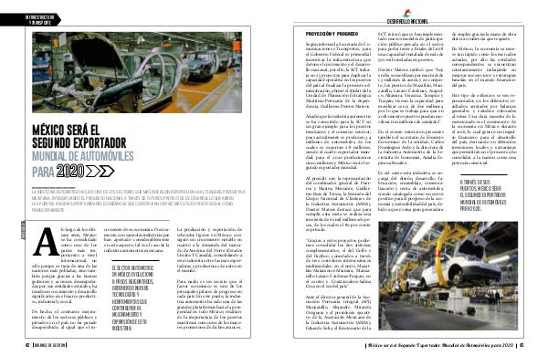 Añadió que la industria automotriz se ha convertido para la SCT en un gran ejemplo para los puertos mexicanos y el comercio exterior, pues actualmente se producen 3.4 millones de automóviles, de los cuales se exportan 2.8 millones, siendo el cuarto exportador mundial; para el 2020 produciremos cinco millones y México será el segundo exportador mundial.