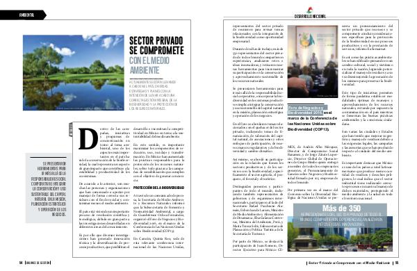 Por primera vez en el marco del Convenio sobre la Diversidad Biológica de Naciones Unidas se pre- senta un pronunciamiento del sector privado que reconoce y se compromete a incluir consideraciones específicas para la protección de la biodiversidad en sus procesos productivos y en la prestación de servicios, informó la Semarnat.