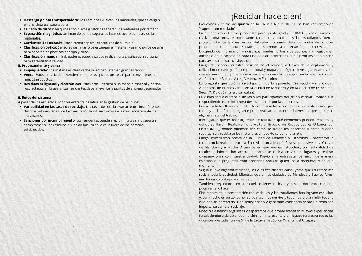 5. Procesamiento y venta Empaquetado: Los materiales clasificados se empaquetan en grandes fardos. Venta: Estos materiales se venden a empresas que los procesan para convertirlos en nuevos productos. Residuos peligrosos y electrónicos: Estos artículos tienen un manejo especial y no son recolectados en la acera. Los residentes deben llevarlos a puntos de entrega designados.