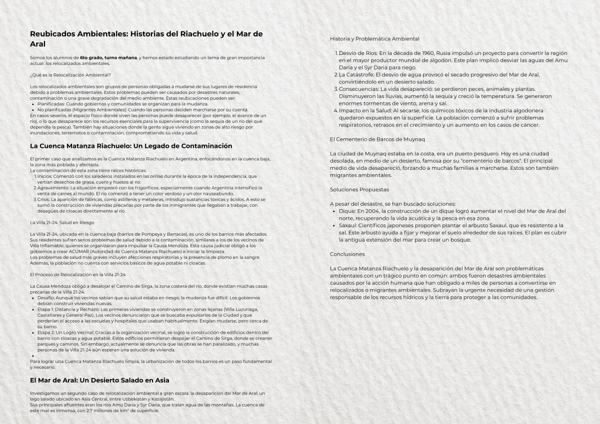 La Cuenca Matanza Riachuelo y la desaparición del Mar de Aral son problemáticas ambientales con un trágico punto en común: ambos fueron desastres ambientales causados por la acción humana que han obligado a miles de personas a convertirse en relocalizados o migrantes ambientales. Subrayan la urgente necesidad de una gestión responsable de los recursos hídricos y la tierra para proteger a las comunidades.