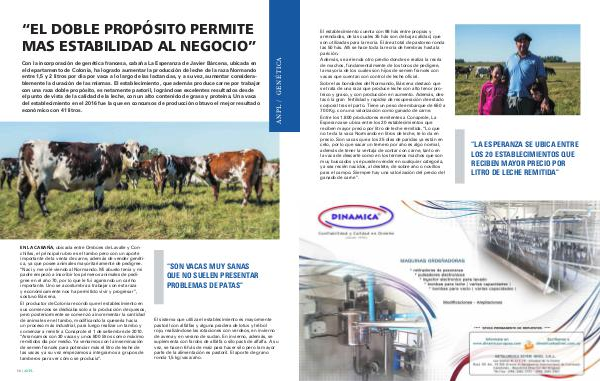 Con la incorporación de genética francesa, cabaña La Esperanza de Javier Bárcena, ubicada en el departamento de Colonia, ha logrado aumentar la producción de leche de la raza Normando entre 1,5 y 2 litros por día por vaca a lo largo de las lactancias, y a su vez, aumentar considerablemente la duración de las mismas. El establecimiento, que además produce carne por trabajar con una raza doble propósito, es netamente pastoril, lográndose excelentes resultados desde el punto de vista de la calidad de la leche, con un alto contenido de grasa y proteína. Una vaca del establecimiento en el 2016 fue la que en concursos de producción obtuvo el mejor resultado económico con 41 litros.