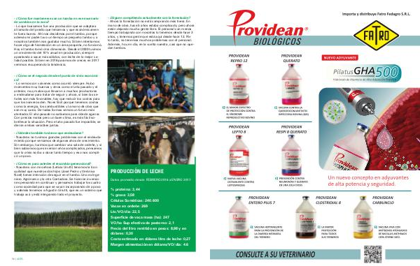 % proteína: 3,44 % grasa: 3,58 Células Somáticas: 240.600 Vacas en ordeñe: 269 Lts / VO / día: 22,5 Superficie de vaca masa( ha): 247 VO / ha Sup efectiva de pastoreo: 2,1 Precio del litro remitido en pesos: 8,98 y en dólares: 0,30 Costo estimado en dólares litro de leche: 0,27 Margen alimentación en dólares / VO / día: 4.6