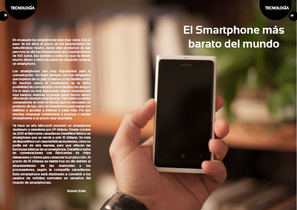 Ya hace un año Microsoft presentó un smartphone destinado a vernderse por 29 dólares. Desde octubre de 2015 el fabricante canadiense DataWind fabrica un smartphone que se vende a solo 15 dólares. Se trata de dispositivos con características modestas, como no podía ser de otra manera, pero que ofrecen las funciones básicas de un smartphone. DataWind estba en conversaciones con fabricantes de chips taiwaneses y chinos para comenzar la producción. El precio de 15 dólares es viable hoy en día debido al abaratamiento de las memorias y los procesadores, según la compañía canadiense. Este smartphone está destinado a convertir a los usarios de móviles normales en usuarios del mundo de smartphones.