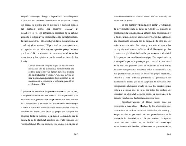 En los cuentos“ Más allá de la carne " y " El legado de la venerable María de Jesús de Ágreda ", se presenta el problema de la identidad desde el tema de la premonición y la trans-carnación de las almas. Las protagonistas sufren de una alucinación causada por la búsqueda de algo que de valor a su existencia. Sin embargo, en ambos cuentos las protagonistas tienden a sufrir un desdoblamiento que las conduce a la pérdida de la identidad para adoptar la identidad de la persona que estudian o investigan. Esta experiencia es la usurpación por un segundo yo, que como tal, se introduce en la vida del primero como el resultado de una fuerza desconocida que usa y trasciende todas las conocidas. Las dos protagonistas, en lugar de buscar su propia identidad, recurren a una prestada perdiendo la posibilidad de autenticidad, actitud que no es aceptable en estos días. Por consiguiente, el discurso creado en estos dos cuentos es una crítica a la mujer que no trata, por todos los medios, de encontrar su identidad, o mejor dicho, su inserción en la historia y rechazo de las limitaciones subjetivas.