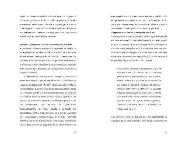 corresponde la suscripción, administración y modificación de los contratos petroleros, así como de la asignación de áreas para la operación de las empresas públicas y de las actividades a ser delegadas a las empresas privadas. Empresas estatales en la industria petrolera Las empresas estatales de petróleo cada vez ganan el control del mercado mundial frente a las empresas privadas, ya que en los años setenta, las reservas de petróleo de las empresas estatales solo correspondían al 10 % del total mundial, pero en la actualidad, las empresas estatales suman más del 85 % de las reservas comerciales de petróleo y 65 % de las reservas disponibles de gas.( Cabrales, 2014) afirma: