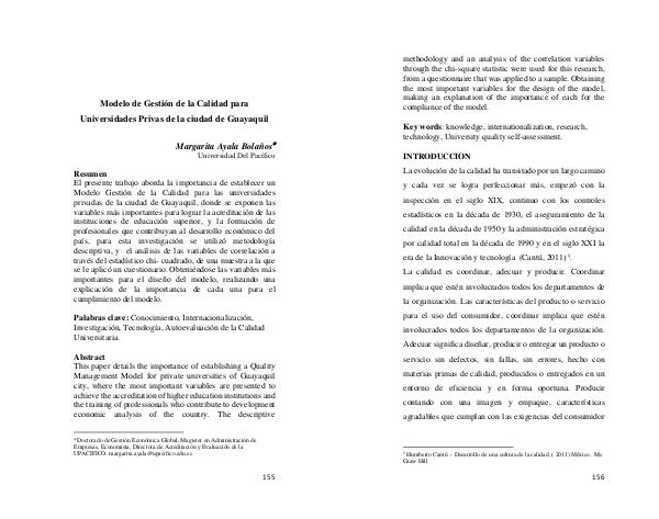 Resumen El presente trabajo aborda la importancia de establecer un Modelo Gestión de la Calidad para las universidades privadas de la ciudad de Guayaquil, donde se exponen las variables más importantes para lograr la acreditación de las instituciones de educación superior, y la formación de profesionales que contribuyan al desarrollo económico del país, para esta investigación se utilizó metodología descriptiva, y el análisis de las variables de correlación a través del estadístico chi- cuadrado, de una muestra a la que se le aplicó un cuestionario. Obteniéndose las variables más importantes para el diseño del modelo, realizando una explicación de la importancia de cada una para el cumplimiento del modelo.