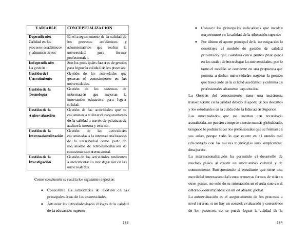 � Por último el aporte principal de la investigación lo constituye el modelo de gestión de calidad presentado, que coordina cinco puntos principales en los cuales deben trabajar las universidades, por lo tanto el modelo se convierte en una propuesta que permita a dichas universidades mejorar la gestión que trasciende en la calidad académica y culmina en profesionales altamente capacitados. La Gestión del conocimiento tiene una incidencia transcendente en la calidad debido al aporte de los docentes y los estudiantes en la calidad de la Educación Superior. Las universidades que no cuentan con tecnología actualizada, no pueden competir en este mundo globalizado, tampoco lo podrán hacer los profesionales que se forman en sus aulas, porque todo lo que ocurre en el mundo está relacionado con las nuevas tecnologías sino simplemente desaparece. La internacionalización ha permitido el desarrollo de muchos países al existir un intercambio cultural y de conocimiento. Enriqueciendo al estudiante que tiene una movilidad internacional al conocer nuevas formas de vida en otros países, no solo de su interacción en el aula sino en el entorno, convirtiéndose en un estudiante global. La autoevaluación es el aseguramiento de los procesos a nivel interno, si no hay un control, evaluación y correctivos de los procesos, no se puede lograr la calidad de la