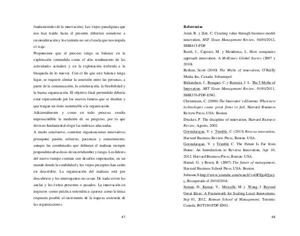 Referencias Amit, R. y Zott, C. Creating value through business model innovation, MIT Sloan Management Review, 04 / 01 / 2012, SMR415-PDF Barsh, J., Capozzi, M. y Mendonca, L. How companies approach innovation: A McKinsey Global Survey( 2007 y 2010). Berkun, Scott( 2010) The Myths of innovation, O’ Reilly Media Inc, Canada: Sebastopol. Birkinshaw, J., Bouquet, C. y Barsoux, J. L. The 5 Myths of Innovation, MIT Sloan Management Review, 01 / 01 / 2011, SMR376-PDF-ENG. Christensen, C.( 2000) The Innovator’ s dilemma: When new technologies cause great firms to fail, Harvard Business Review Press, USA: Boston. Drucker, P. The discipline of innovation. Harvard Business Review, Agosto, 2002. Govindarajan, V. y Trimble, C.( 2013) Reverse innovation, Harvard Business Review Press, Boston: USA. Govindarajan, V. y Trimble C. The Future Is Far from Home: An Introduction to Reverse Innovation, Apr 10, 2012. Harvard Business Press, Boston: USA. Hamel, G. y Breen, B.( 2007) The future of management, Harvard Business School Press, USA: Boston. Johnson, S. http:// www. youtube. com / watch? v = OFEgi4Qyzy c, Recuperado el 20 / 10 / 2014. Soman, D., Kumar, V., Metcalfe, M. y Wong, J. Beyond Great Ideas: A Framework for Scaling Local Innovations, Sep 01, 2012, Rotman School of Management, Toronto: Canada, ROT180-PDF-ENG.