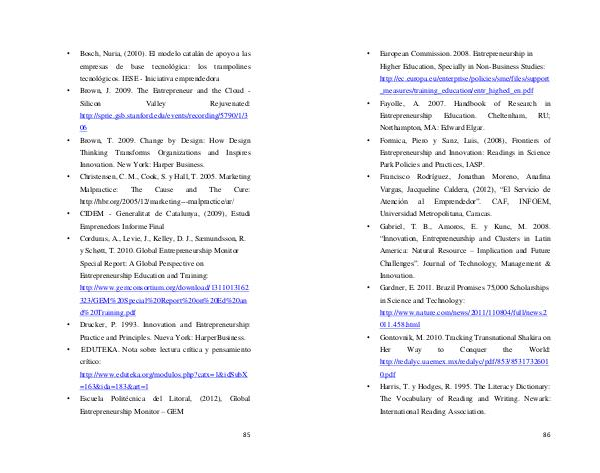 • Gabriel, T. B., Amoros, E. y Kunc, M. 2008.“ Innovation, Entrepreneurship and Clusters in Latin America: Natural Resource – Implication and Future Challenges”. Journal of Technology, Management & Innovation.
