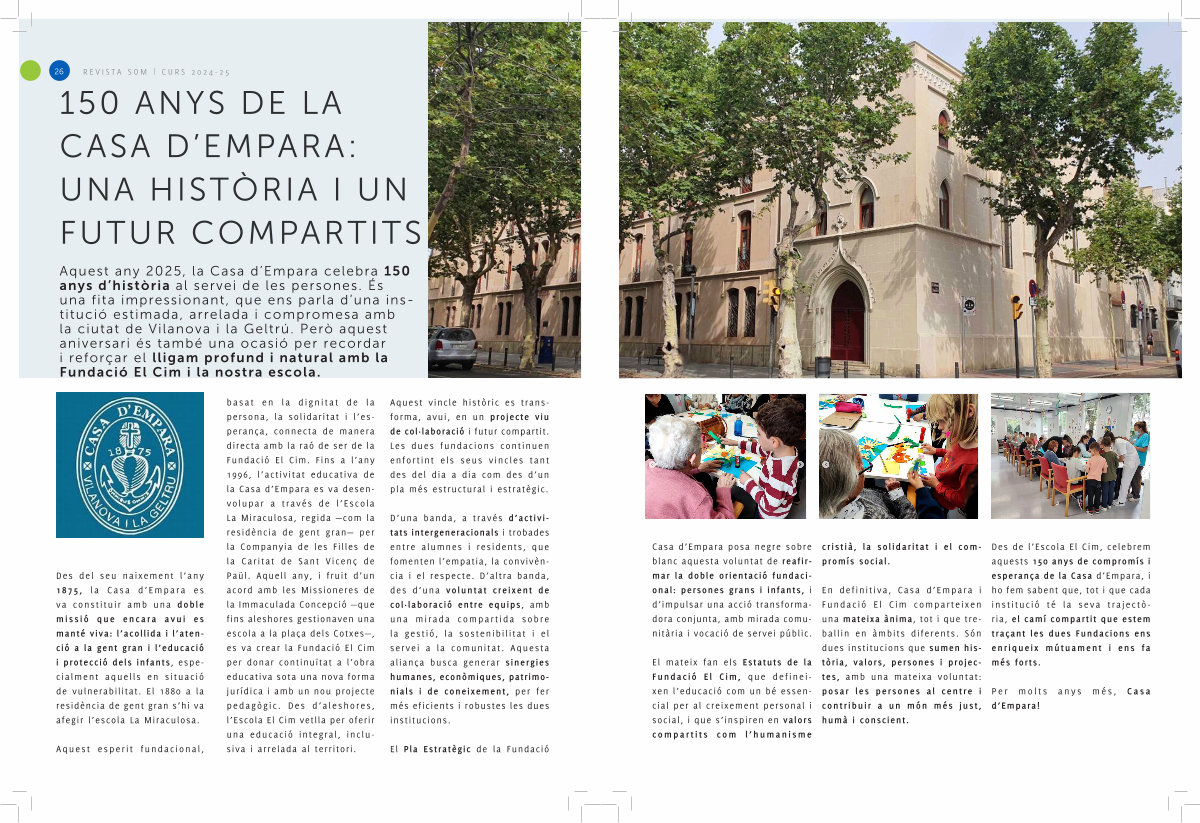 Des de l’ Escola El Cim, celebrem aquests 150 anys de compromís i esperança de la Casa d’ Empara, i ho fem sabent que, tot i que cada institució té la seva trajectòria, el camí compartit que estem traçant les dues Fundacions ens enriqueix mútuament i ens fa més forts.