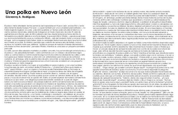 El polaco tenía alrededor de tres semanas de hospedarse en Nuevo León, era escritor y venía directamente desde Europa. Por azar— y quizá también por una curiosidad premeditada—, no había logrado regresar a su país, y decidió quedarse un tiempo para estudiar el idioma y a ciertos autores nacionales, además de indagar en el modo mexicano de vida. El calor de septiembre era infernal, pero el último sábado del mes, desde tempranas horas del día, la temperatura se abatió debido a una lluvia ligera, lo que permitió a Vitoldo— apodo puesto por sus vecinos de habitación, pues su nombre era Witold— salir del modesto hotel y conocer mejor el lugar. Juró no regresar hasta haber vivido la verdadera �esta mexicana de la que tanto había escuchado en su país. En México, percibía que cada �n de semana era de festejo, incluso aunque no tuvieran nada que celebrar:“ quizás es porque el mexicano trabaja demasiado y sólo existe los �nes de semana”, pensaba Vitoldo, mientras se colocaba un pequeño sombrero para salir. La calle, que en días soleados mostraba un pálido concreto, hoy se tornaba gris ante la lluvia, y el polaco— de piel pálida también— salió caminando con un chaleco de estambre negro sobre su camisa blanca. Caminó durante algunos minutos entre la soledad de las calles y visitó los lugares que habían llamado su atención con anterioridad, pero todos se encontraron cerrados; sin embargo, ante la pésima idea de salir y encontrar un bar abierto a las 10:00 de la mañana, Vitoldo recuperó la esperanza al escuchar música de acordeón en una pequeña zona de bares un tanto marginal. El polaco se detuvo frente a un lugar, el cual exhibía sin pena ni gloria, y con unas humildes lucecitas rojas de neón, el nombre de Bar El Tololoche—“¿ Tololoche? ¿ Pero qué mierda es eso?”, pensó Witold—, sacó un cigarro y fumando analizó detenidamente su fachada; se sorprendió bastante al lograr comprender el menú y los precios llenos de faltas de ortografía que se exhibían fuera del bar. Pensó tener el su�ciente dinero y, todavía con el cigarro encendido, decidió entrar. Cruzó las puertas que en vaivén se cerraron detrás de él, dio tres pasos y no pudo avanzar más, se quedó ahí, inerte, sin poder expresar de manera coherente la vida que sus ojos veían, una alegría que pareciera estarle vedada en su país de origen. Sobre una tarima se encontraban dos parejas bailando al ritmo endemoniado del acordeón, usaban unas botas que pisaban con desprecio la madera en repetidas ocasiones, las piernas eran sólo perceptibles gracias al sonido de los tacones: un sonido hueco, rítmico, de cadencioso estrépito, como si la madera estuviera al borde de la quiebra por aquel baile lleno de vueltas, donde los brazos subían y bajaban, y las faldas rojas de las mujeres se abrían en forma de círculos perfectos ante los giros que los bailarines de chalecos negros ejecutaban sin perder el ritmo de los pies. Tres músicos— con tarola, contrabajo y acordeón— se hallaban en el centro del lugar, siendo rodeados de todas las mesas, vestidos por completo de una mezclilla café y con camisas blancas; movían sus cabezas, sus enormes sombreros, y sus descomunales barrigas al ritmo de la música que inundaba por completo el lugar.“¡ Así, hijesushing ' amadre!”, gritó el hombre