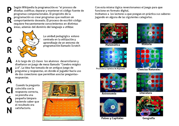 A lo largo de 13 clases los alumnos desarrollaron y diseñaron un juego de mesa llamado “Cerebro mágico 2.0”. La idea fue tomada de un antiguo juego de preguntas y respuestas, en donde el jugador hacia uso de dos conectores que permitían asociar preguntas-respuestas.