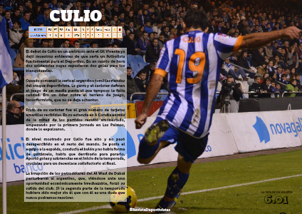 El debut de Culio en un amistoso ante el Gil Vicente ya dejó muestras evidentes de que sería un futbolista fundamental para el Deportivo. En un cuarto de hora dos asistencias suyas supusieron dos goles para los blanquiazules.
