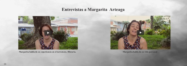 Entrevistas a Margarita Arteaga Margarita habla de su experiencia en el terremoto. Historia. 28 Margarita habla de su vida personal 29