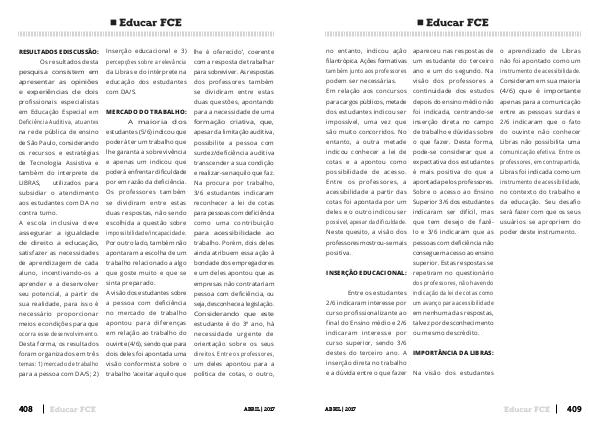 Os resultados desta pesquisa consistem em apresentar as opiniões e experiências de dois profissionais especialistas em Educação Especial em Deficiência Auditiva, atuantes na rede pública de ensino de São Paulo, considerando os recursos e estratégias de Tecnologia Assistiva e também do interprete de LIBRAS, utilizados para subsidiar o atendimento aos estudantes com DA no contra turno. A escola inclusiva deve assegurar a igualdade de direito a educação, satisfazer as necessidades de aprendizagem de cada aluno, incentivando-os a aprender e a desenvolver seu potencial, a partir de sua realidade, para isso é necessário proporcionar meios e condições para que ocorra esse desenvolvimento. Desta forma, os resultados foram organizados em três temas: 1) mercado de trabalho para a pessoa com DA / S; 2)