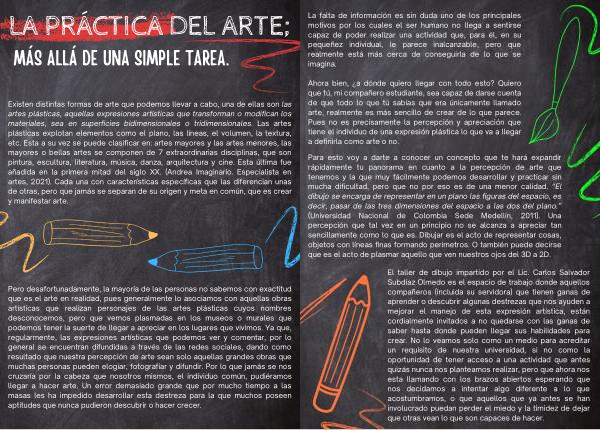 Pero desafortunadamente , la mayoría de las personas no sabemos con exactitud que es el arte en realidad , pues generalmente lo asociamos con aquellas obras artísticas que realizan personajes de las artes plásticas cuyos nombres desconocemos , pero que vemos plasmadas en los museos o murales que podemos tener la suerte de llegar a apreciar en los lugares que vivimos . Ya que , regularmente , las expresiones artísticas que podemos ver y comentar , por lo general se encuentran difundidas a través de las redes sociales , dando como resultado que nuestra percepción de arte sean solo aquellas grandes obras que muchas personas pueden elogiar , fotografiar y difundir . Por lo que jamás se nos cruzaría por la cabeza que nosotros mismos , el individuo común , pudiéramos llegar a hacer arte . Un error demasiado grande que por mucho tiempo a las masas les ha impedido desarrollar esta destreza para la que muchos poseen aptitudes que nunca pudieron descubrir o hacer crecer .