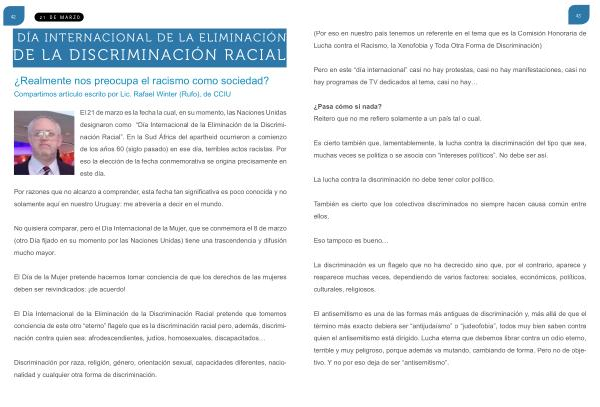 ( Por eso en nuestro país tenemos un referente en el tema que es la Comisión Honoraria de Lucha contra el Racismo , la Xenofobia y Toda Otra Forma de Discriminación )