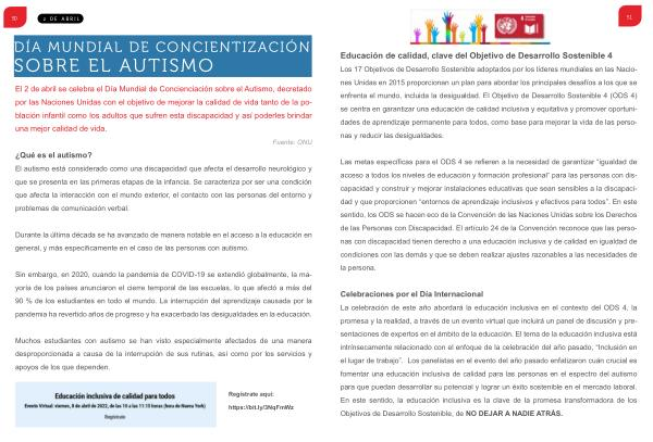 Celebraciones por el Día Internacional La celebración de este año abordará la educación inclusiva en el contexto del ODS 4 , la promesa y la realidad , a través de un evento virtual que incluirá un panel de discusión y presentaciones de expertos en el ámbito de la educación . El tema de la educación inclusiva está intrínsecamente relacionado con el enfoque de la celebración del año pasado , “ Inclusión en el lugar de trabajo ”. Los panelistas en el evento del año pasado enfatizaron cuán crucial es fomentar una educación inclusiva de calidad para las personas en el espectro del autismo para que puedan desarrollar su potencial y lograr un éxito sostenible en el mercado laboral . En este sentido , la educación inclusiva es la clave de la promesa transformadora de los Objetivos de Desarrollo Sostenible , de NO DEJAR A NADIE ATRÁS .