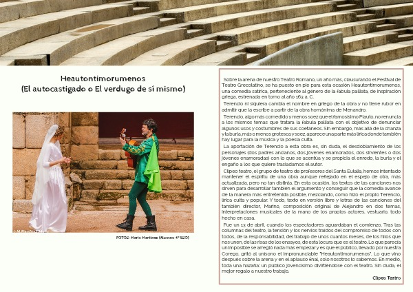 Fue un 13 de abril, cuando los espectadores aguardaban el comienzo. Tras las columnas del teatro, la tensión y los nervios traídos del compromiso de todos con todos, de la responsabilidad, del trabajo de unos cuantos meses, de los hilos que nos unen, de las risas de los ensayos, de esta locura que es el teatro. Lo que parecía un imposible se arregló nada más empezar y es que el público, llevado por nuestra Corego, gritó al unísono el impronunciable “Heautontimorumenos”. Lo que vino después sobre la arena y en el aplauso final, solo nosotros lo sabemos. En medio, toda una hazaña: un público jovencísimo divirtiéndose con el teatro. Sin duda, el mejor regalo a nuestro trabajo.