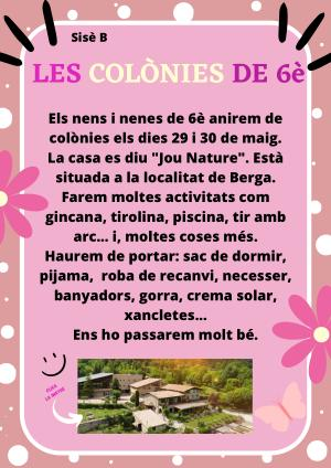 Els nens i nenes de 6è anirem de colònies els dies 29 i 30 de maig . La casa es diu " Jou Nature ". Està situada a la localitat de Berga . Farem moltes activitats com gincana , tirolina , piscina , tir amb arc ... i , moltes coses més . Haurem de portar : sac de dormir , pijama , roba de recanvi , necesser , banyadors , gorra , crema solar , xancletes ... Ens ho passarem molt bé . Clica la imatge