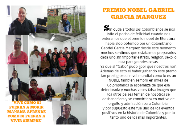 Sin duda a todos los Colombianos se nos inflo el pecho de felicidad cuando nos enteramos que el premio nobel de literatura habia sido obtenido por un Colombiano Gabriel Garcia Marquez desde este momento muchos sentimos que estabamos preparados cada uno sin importar estrato, religion, sexo, o raza para grandes cosas.