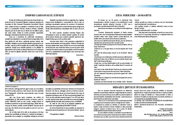 Izvoarele / Ediţia V./3. pagina 6. DESPRE CARNAVALUL ZĂPEZII În data de 23 februarie, atât borsecenii, cât și turiștii s-au putut bucura de Carnavalul Zăpezii, eveniment organizat de Asociația de Schi, Forumul Tineretului, Dezvoltare Urbană S.R.L. și Papa la Sanyi, cu sprijinul Consiliului Local, al Vilei Riki și al pensiunilor Korona, Kerek și Fitness. Serbările Zăpezii, așa cum le știm noi, au câteva zeci de ediții în spate, dar anul acesta, având în vedere perioada organizării, fărșangul, evenimentul a fost botezat Carnaval. Deși nu a beneficiat de publicitate răsunătoare, numărul participanților a permis derularea programelor de la baza pârtiei de schi într-o ambianță aproape intimă, mai familială. Adulții și-au putut încălzi mâinile și grumazul cu un vin fiert, copii și-au făcut mustăți din ciocolată caldă, până și trecătorii, curioșii și-au încălzit spiritele cu un păhărel de Jägermeister. Sub soarele cu dinți și vântul rece de se-mbujora chiar și omul de zăpadă, băuturile calde le-au venit de hac tuturor. Membrii Asociației de Schi au organizat și au vegheat asupra bunei desfășurări a concursului de schi la care au participat aproximativ patruzeci de persoane. Pe jumătatea pârtiei Speranța concursul s-a derulat în funcție de categorii de vârstă, demonstrându-și cunoștințele atât cei mici, cât și cei mari. În orele amiezii, membrii teatrului Figura din Gheorgheni au ținut un atelier destinat copiilor, în cadrul căruia piticii iscusiți și-au realizat propriile marionete din linguri de lemn, pe care le-au și luat acasă. Atracția orelor târzii a fost petrecerea organizată în incinta restaurantului de la baza pârtiei. Tehnica de lumini și de sunet, piesele alese marca DJ Ștefi au evocat acea ambianță de discotecă de care tinerii din Borsec nu mai au parte decât ocazional. Nu este de mirare că petrecăreții s-au întors acasă în zori de zi, nemailuând în seamă frigul crunt care mușca din dimineața argintie. Fazakas Emese fotografii: Biró Richárd (continuare de pe pagina 5.) Este vorba de a strânge prietenii, gaşca, trupa, şi cu un minim de efort să cureţi o parcare, o vale, un parc sau orice suprafaţă care “deranjează” ochiul din cauza mizeriei. Aşa-i că sună frumos????!!!! Aşa cum facem sport conştient, asa trebuie să conştientizăm că, fără ajutorul nostru, al tuturor, acest loc numit PĂMÂNT, dacă nu este ocrotit, curăţat, hrănit cu bunătatea noastră nu va mai rezista mult timp. Trăim într-un oraş aşa de frumos, mirific, numit BORSEC. Suntem aşa de norocoşi, dar trebuie să şi avem grijă de acest loc care ne-a oferit adăpost. Eu cu fetele mele de la sală ne-am propus ca în luna aprilie să ne mobilizăm şi să facem 2-3 acţiuni de strângere a gunoaielor. Pur şi simplu ne cumpărăm mănuşi şi saci mari menajeri şi ne plimbăm să zicem pe varianta care înconjoară Borsecul (3,5 km) şi strângem pet-uri şi lucruri aruncate. Facem şi mişcare dar facem şi un lucru benefic. Nu vreau să ajungem la polemica aceea că: “dar cine aruncă să strângă” sau “de ce nu sunt suficiente coşuri de gunoi “ etc. NU! Am văzut cu toţii, că şi dacă sunt coşuri, de multe ori se aruncă pe lângă şi degeaba căutăm vinovaţii, aceia suntem tot noi , OAMENII. În cazul în care vreţi să vă alăturaţi iniţiativei sau provocării, noi vă aplaudăm şi PĂMÂNTUL la fel! Şi nu în ultimul rând, vă mai anunţăm că, mişcarea la sală este în ziua de vineri de la ora 17 la Casa de Cultură - sala de sus. Vă aşteptăm cu drag!!!! Bordanciuc Julianna