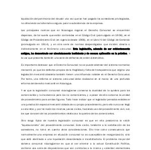 Otro rasgo típico de nuestra legislación concursal es que en ella predomina la visión“ liquidacionista” del procedimiento concursal. Esta visión, tendente a la satisfacción de los acreedores, no toma en cuenta otras consideraciones. Ello trae como consecuencia que normalmente una empresa en situación concursal no es susceptible de reorganización, sino que está destinada a una liquidación desordenada e insatisfactoria. El problema mayor del sistema concursal nicaragüense es que al ser anterior a la actual Constitución Política, contiene una serie de disposiciones que son contrarias a la misma y violentan elementales derechos garantizados por ésta. Por todas estas razones, es imperativo llevar a cabo una reforma total al sistema concursal.