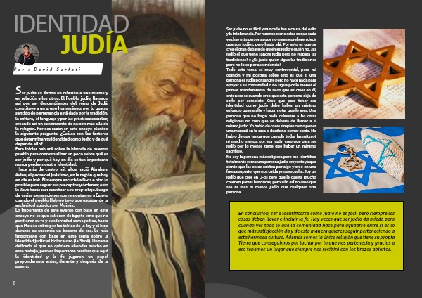 En conclusión, ser e identificarse como judío no es fácil pero siempre las cosas deben llevar e incluir la fe. Hay veces que ser judío da miedo pero cuando ves todo lo que la comunidad hace para ayudarse entre sí es lo que más satisfacción da y de esta manera quieres seguir perteneciendo a esta hermosa cultura. Además somos la única religión que tiene su propia Tierra que conseguimos por luchar por lo que nos pertenecía y gracias a eso tenemos un lugar que siempre nos recibirá con los brazos abiertos.