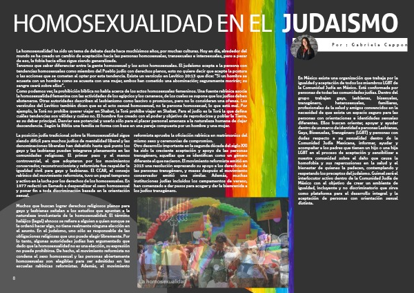 Tenemos que saber diferenciar entre la gente homosexual y los actos homosexuales. El judaísmo acepta a la persona con tendencias homosexuales como miembro del Pueblo judío con derechos plenos, esto no quiere decir que acepte la postura o las acciones que se cometen al optar por esta tendencia. Existe un versículo en Levítico 20:13 que dice: “Si un hombre se acuesta con un hombre como se acuesta con una mujer, ambos han cometido una abominación; seguramente morirán; su sangre caerá sobre ellos”.
