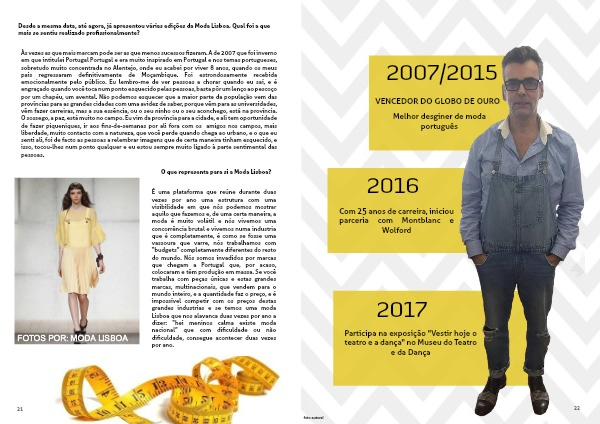 É uma plataforma que reúne durante duas vezes por ano uma estrutura com uma visibilidade em que nós podemos mostrar aquilo que fazemos e, de uma certa maneira, a moda é muito volátil e nós vivemos uma concorrência brutal e vivemos numa industria que é completamente, é como se fosse uma vassoura que varre, nós trabalhamos com “budgets” completamente diferentes do resto do mundo. Nós somos invadidos por marcas que chegam a Portugal que, por acaso, colocaram e têm produção em massa. Se você trabalha com peças únicas e estas grandes marcas, multinacionais, que vendem para o mundo inteiro, e a quantidade faz o preço, e é impossível competir com os preços destas grandes industrias e se temos uma moda Lisboa que nos alavanca duas vezes por ano a dizer: “hei meninos calma existe moda nacional” que com dificuldade ou não dificuldade, consegue acontecer duas vezes por ano.