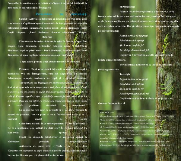 Prezenţa : După ce se salută toţi copii , se observă în grupă o marionetă , Ina cea Înţelegătoare , care stă singură pe un scăunel . Educatoarea apropie marioneta de copii şi o prezintă acestora :