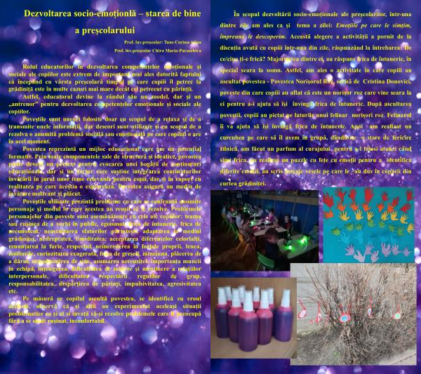 În scopul dezvoltării socio-emoţionale ale preşcolarilor , într-una dintre zile am ales ca și tema a zilei : Emoțiile pe care le simțim , împreună le descoperim . Această alegere a activității a pornit de la discuția avută cu copiii într-una din zile , răspunzând la întrebarea : De ce / cine ți-e frică ? Majoritatea dintre ei , au răspuns frica de întuneric , în special seara la somn . Astfel , am ales o activitate în care copiii au ascultat povestea - Povestea Norișorul Roz , scrisă de Cristina Donovici , poveste din care copiii au aflat că este un norișor roz care vine seara la ei pentru a-i ajuta să își învingă frica de întuneric . După ascultarea poveștii , copiii au pictat pe laturile unui felinar norișori roz . Felinarul îi va ajuta să își învingă frica de întuneric . Apoi am realizat un curcubeu pe care să îl avem în grupă , dându-ne o stare de fericire zilnică , am făcut un parfum al curajului pentru a-l folosi atunci când simt frica , au realizat un puzzle cu fețe cu emoții pentru a identifica diferite emoții , au scris mesaje vesele pe care le – au dus în copacii din curtea grădiniței .