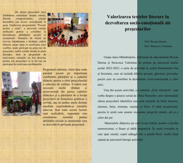 Una din aceste activități , s-a intitulat „ Țică- Emoțică ”, este vorba despre o poezie scrisă de Oltea Paraschiv , prin intermediul căreia preșcolarii identifică care sunt emoțiile de bază : bucuria , uimirea , furia , tristețea , rușinea și frica . O dată recunoscute , poezia le arată cum anume recunoasc propriile emoții , cât și a celor din jur .