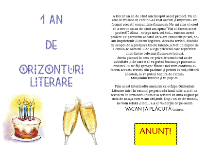 Prin acest intermediu anunţăm ca echipa Orizonturi Literare intră în vacanţă pe perioada lunii iulie, aşa că ne revedem cu următorul număr al revistei în luna august pe data de 10, aşa cum v-am obişnuit. După un an de muncă, ne vom relaxa şi noi... aşa că vă dorim de pe-acum VACANŢĂ PLĂCUTĂ tuturor.