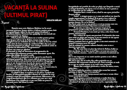-Nu. Nu este bine să pleci în tabără la Sulina, bufni ea într-un târziu. Ce să faci acolo? Într-o zi vezi tot orășelul… nu ai cluburi, cinema… cred că nici conexiune la internet nu este.