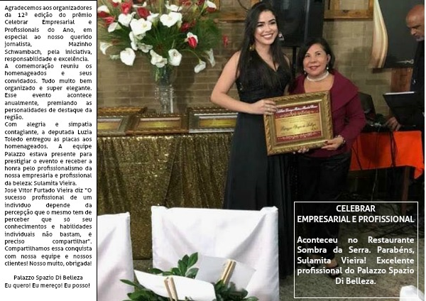 Com alegria e simpatia contagiante, a deputada Luzia Toledo entregou as placas aos homenageados. A equipe Palazzo estava presente para prestigiar o evento e receber a honra pelo profissionalismo da nossa empresária e profissional da beleza: Sulamita Vieira.