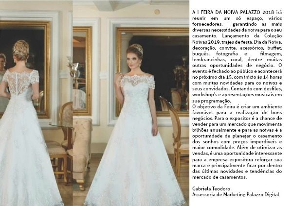A I FEIRA DA NOIVA PALAZZO 2018 irá reunir em um só espaço, vários fornecedores, garantindo as mais diversas necessidades da noiva para o seu casamento. Lançamento da Coleção Noivas 2019, trajes de festa, Dia da Noiva, decoração, convite, acessórios, buffet, buquês, fotografia e filmagem, lembrancinhas, coral, dentre muitas outras oportunidades de negócio. O evento é fechado ao público e acontecerá no próximo dia 15, com início às 14 horas com muitas novidades para os noivos e seus convidados. Contando com desfiles, workshop’s e apresentações musicais em sua programação.