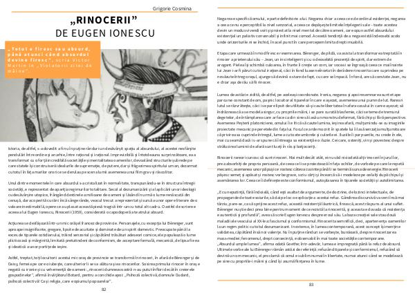 Astfel, treptat, toţi locuitorii acestui mic oraş de provincie se transformă în rinoceri, în afară de Bèrenger şi de