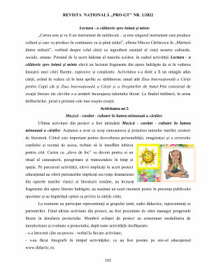 „ Cartea este şi va fi un instrument de neînlocuit ... şi este singurul instrument care produce cultură şi care va produce în continuare ca şi până astăzi ”, afirma Mircea Cărtărescu în „ Mărturii dintre milenii ”, vorbind despre rolul cărţii ca ingredient esenţial al vieţii noastre culturale , sociale , umane . Pornind de la acest îndemn al marelui scriitor , în cadrul activității Lectura - o călătorie spre inimă şi minte elevii au lecturat fragmente din opere îndrăgite de ei în vederea însuşirii unei citiri fluente , expresive şi conştiente . Activitatea s-a dorit a fi un omagiu adus cărţii , având în vedere că în luna aprilie se sărbătoresc anual atât Ziua Internaţională a Cărţii pentru Copii cât şi Ziua Internaţională a Cărţii şi a Drepturilor de Autor . Prin concursul de creaţii literare ale elevilor s-a urmărit încurajarea talentului literar . La finalul întâlnirii , în urma deliberărilor , juriul a premiat cele mai reuşite creaţii .