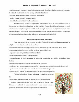 Ca urmare a activităţilor derulate în cadrul Proiectului educaţional Lumea minunată a cărților au fost obţinute următoarele rezultate : - materiale informative despre proiect şi activităţile derulate : pliante , articole în presa locală ; - materiale publicate în revista şcolii şi pe site-ul www . didactic . ro ; -expunerea unor fotografii din activităţile realizate ; - alcătuireaunuijurnal al activităţilordesfăşurate ; - numărul ridicat de elevi participanţi la activităţile extraşcolare care cultivă deschiderea spre lectură ; - stabilirea de relaţii de colaborare între instituţiile partenere ; - realizarea unor acţiuni de calitate care au fost înregistrate şi apoi publicate pe diferite site-uri ; - publicarea în presa locală a unor articole despre activităţile din proiect ; - prezentarea în Consiliul Profesoral a modului în care s-a finalizat proiectul .