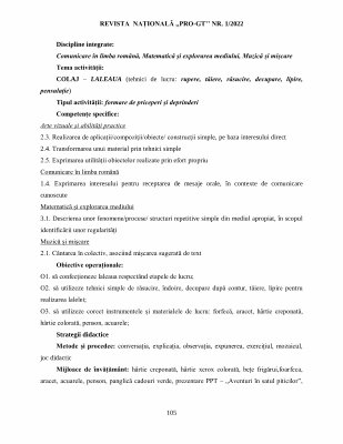 Discipline integrate : Comunicare în limba română , Matematică și explorarea mediului , Muzică și mișcare Tema activității : COLAJ – LALEAUA ( tehnici de lucru : rupere , tăiere , răsucire , decupare , lipire , pensulație ) Tipul activității : formare de priceperi și deprinderi Competențe specifice : Arte vizuale și abilități practice 2.3 . Realizarea de aplicaţii / compoziţii / obiecte / construcţii simple , pe baza interesului direct 2.4 . Transformarea unui material prin tehnici simple 2.5 . Exprimarea utilităţii obiectelor realizate prin efort propriu Comunicare în limba română 1.4 . Exprimarea interesului pentru receptarea de mesaje orale , în contexte de comunicare cunoscute Matematică și explorarea mediului 3.1 . Descrierea unor fenomene / procese / structuri repetitive simple din mediul apropiat , în scopul identificării unor regularităţi Muzică și mișcare 2.1 . Cântarea în colectiv , asociind mişcarea sugerată de text