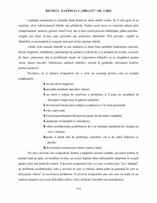 Limbajul emoţional al copilului fiind destul de sărac multă vreme , lui îi este greu să se exprime , să-şi mărturisească trăirile sau gândurile . Pentru acest lucru se exprimă adesea prin comportament , mimică , gesturi , tonul vocii , dar şi prin reacţii precum îmbrăţişări , plâns puternic , strigăte sau chiar lovirea unei persoane sau aruncarea obiectelor . Prin poveste , copilul se identifică cu personajele şi reuşeşte mai uşor să îşi exprime trăirile .
