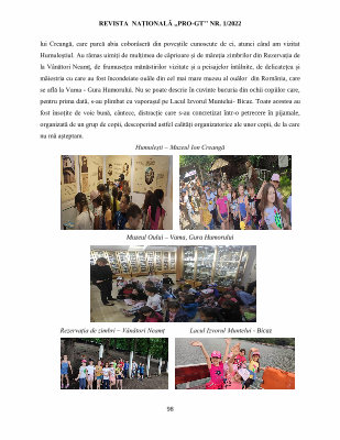 lui Creangă , care parcă abia coborâseră din poveștile cunoscute de ei , atunci când am vizitat Humuleștiul . Au rămas uimiți de mulțimea de căprioare și de măreția zimbrilor din Rezervația de la Vânători Neamț , de frumusețea mănăstirilor vizitate și a peisajelor întâlnite , de delicatețea și măiestria cu care au fost încondeiate ouăle din cel mai mare muzeu al ouălor din România , care se află la Vama - Gura Humorului . Nu se poate descrie în cuvinte bucuria din ochii copiilor care , pentru prima dată , s-au plimbat cu vaporașul pe Lacul Izvorul Muntelui- Bicaz . Toate acestea au fost însoțite de voie bună , cântece , distracție care s-au concretizat într-o petrecere în pijamale , organizată de un grup de copii , descoperind astfel calități organizatorice ale unor copii , de la care nu mă așteptam .