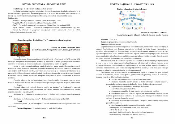 Proiectul regional „ Bucuria copiilor de sărbători ”, ediția a X-a , înscris în CAER , poziția 1634 , urmăreşte îndreptarea atenţiei copiilor , părinţilor şi a cadrelor didactice spre importanţa sărbătoririi diferitelor evenimente , în formarea şi educarea simțului estetic și creativ al copiilor .