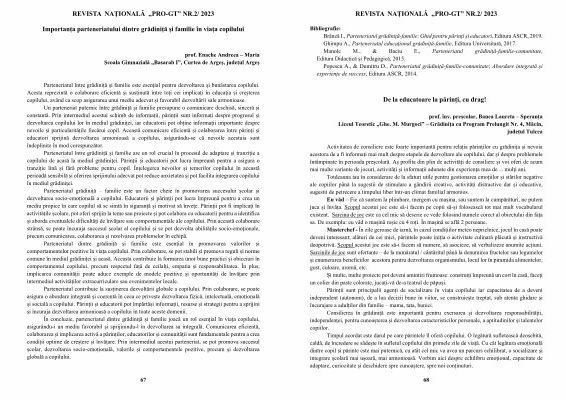 Bibliografie : Brânză I ., Parteneriatul grădiniță-familie : Ghid pentru părinți și educatori , Editura ASCR , 2019 . Ghimpu A ., Parteneriatul educațional grădiniță-familie , Editura Universitară , 2017 . Manole M ., & Baciu E ., Parteneriatul grădiniță-familie-comunitate ,