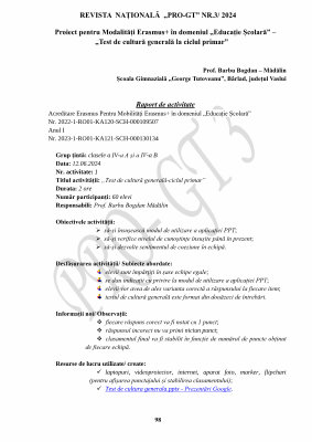 Desfășurarea activității / Subiecte abordate : elevii sunt împărțiți în șase echipe egale ; se dau indicații cu privire la modul de utilizare a aplicației PPT ; elevii vor avea de ales varianta corectă a răspunsului la fiecare item ; testul de cultură generală este format din douăzeci de întrebări .