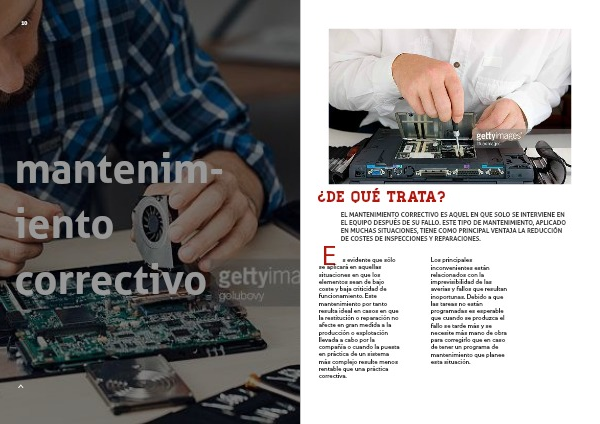 El mantenimiento correctivo es aquel en que solo se interviene en el equipo después de su fallo. Este tipo de mantenimiento, aplicado en muchas situaciones, tiene como principal ventaja la reducción de costes de inspecciones y reparaciones.