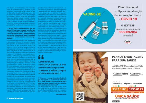 3 - Hoje com o avanço da vacinação ( ainda que lenta ) pode-se observar um alívio nas UTIs . Como acredita que a Covid-19 possa caminhar daqui para a frente sem os altos números de perdas humanas ? Sem dúvida nenhuma ! Hoje nós estamos vendo uma queda significativa no número de internações em UTI . Não temos dúvida que se deve às vacinações . No começo , na primeira onda , como um certo